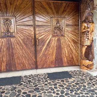 We were so confident after yesterday that the next day we went ashore again. This time to Taiohae, or Ua Huka in Marquesan meaning "Two Holes". (why I have no idea). The land of Tiki's. It is one of the quieter, more rugged islands of the Marquesas and is located in the far northeast of French Polynesia. It is the smallest of the inhibited Marquesas Islands with only 300 residents. It was visited by Captain James Cook in 1774. The walk was nice. Lots of unusual Tiki's and have no idea their meaning either. There was a beautiful church with wooden doors and a nativity scene that was all hand carved. It was called Notre Dame Cathedral.