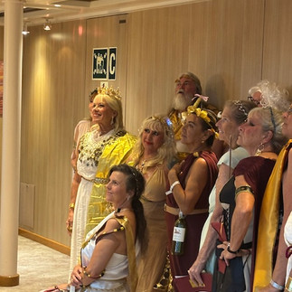 After leaving Dunedin and New Zealand we headed west for, how many Sea Days? Yep..5 more Sea Days until we get to Melbourne, Australia. On our first night out about 100 residents participated in a Mystery Night - A Mystery Among the Gods. I was assigned to be Vesta, the Roman Goddess of the Hearth. Half of the residents were Roman and the other half were Greek but we were all Gods and Goddesses. If you were Greek, you wore a white Toga. If you were Roman, you wore Maroon and Gold. The party began at 3:00 in the afternoon and ended around 11:00pm. Costumes were made by residents with sewing machines, accessories (tiara'a, bracelets, earrings, arm bands, etc) were loaned, borrowed or bought by all of us to share. All done in the name of fun. As you can see, we had a Greek God who was the God of Uranus - white Toga with a brown spot on the back of his Toga (he put the brown spot on himself - we didn't ask).